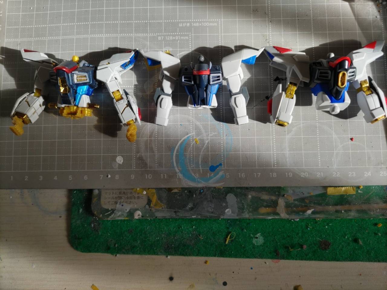 2025/03/11 フリーダムガンダム3体依頼 今回はお得意様から3体をトップコート仕上げで作り上げる要求されましたので、これを作って行こうと思います。 上半身組立て いきなりですが制作の風景がなくて、(左から限定、真ん中ノーマル、右が刀、)申し訳ありません。上半身までが進んだ状態です。 脚組立て 足も組み立てが終わったところです。 バインダー1 ストライクフリーダムガンダムチタニュウムフィニュッシュのバインダーを組立て完了したところです。 バインダー2 フリーダムガンダムのバインダーも完成しました。 バインダー3 マイティストライクフリーダムガンダムのバインダーも 完成しました。 RGストライクフリーダムガンダムチタニュウムフィニュッシュ完成 後部 HGマイティストライクフリーダムガンダム完成 後部 HGフリーダムガンダム完成 後部 ガンプラ