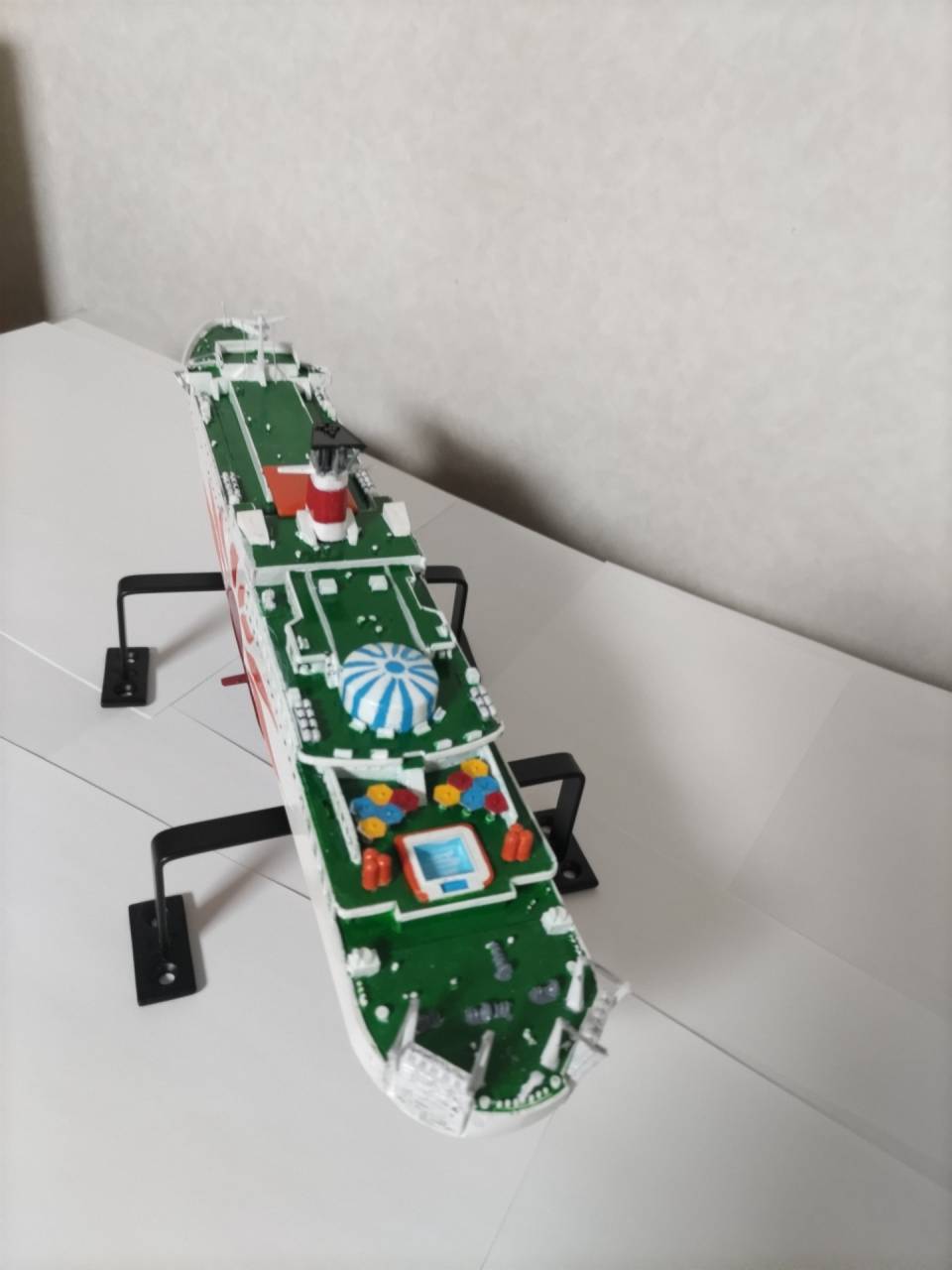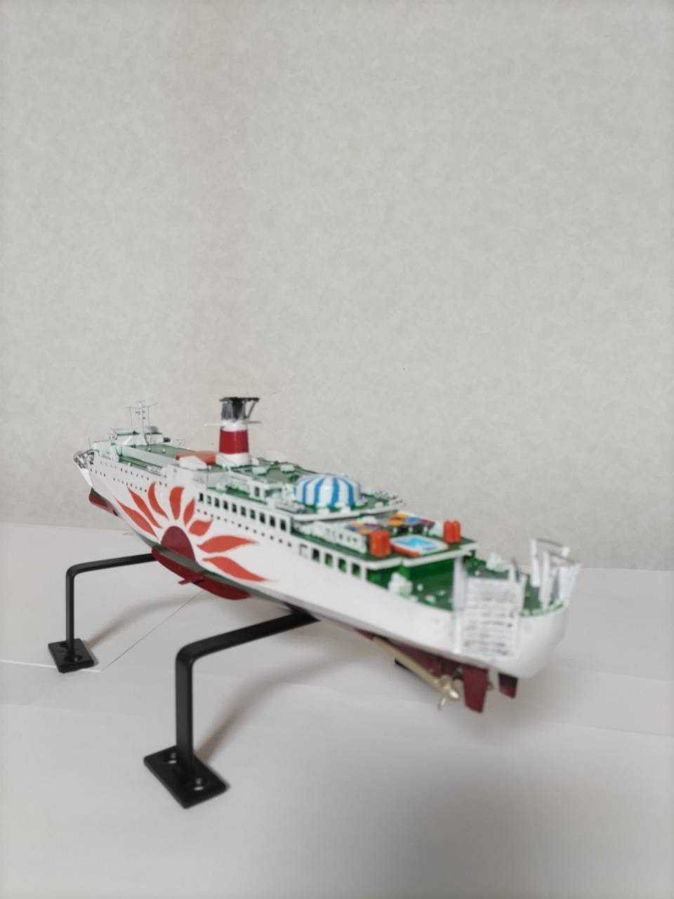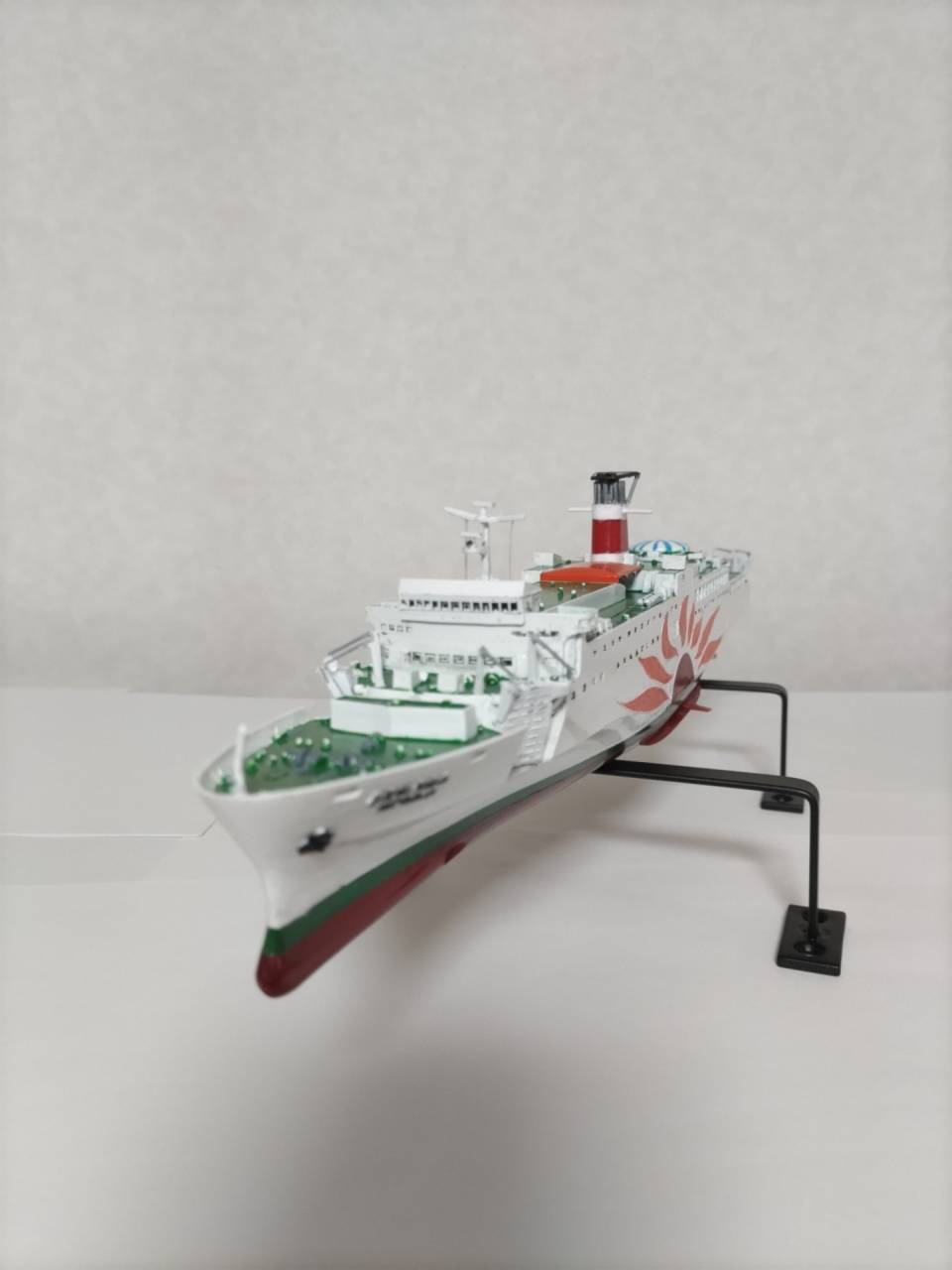 2025/03/18 メーカー・マイクロエースさんふらわ8 今回頼まれましたキットは、マイクロエース社から出されたさんふらわ8を塗装して完成して行きます。 さんふらわ8 キットを仮組みします 最初は船体のバランスやパーツが嵌まるかの全体を確認しながら調整して組立てて行きました。パーツがバリや切 り口跡が多かったので少々根気で行いました。組んだ後に1000番よりの上の紙やすりで足付けを行い塗装に入る為の処理を施してあります。 さんふらわ8 下地処理を施す 仮組みで全体のバランスチェックを確認したので、下地を塗装しました。本体色の白の発色と金属管を際立たせる 目的があったので、今回はガイアEXのシルバーを使い全体をシルバーに塗って行きました。 明るい色は隠ぺい力が弱いから透き通ってすまうので、その為に使うやり方です。今回は模型用仕上がりの目的な ので、希釈は塗料1に対して溶剤1の濃度で全体をふわりとムラなく塗装して行きます。 さんふらわ8 下地塗装をして乾燥した状態です。画像には写っていませんが、ポールや煙突など装飾系の部分なども下地色で施してました。 本塗装に進めて着色して行きます。 各所部位の本体色カラーで説明書にある指示を色を乗せて行き、書かれてない場所については手元に資料が 無かった為、検索を掛けて写真から参考にして色を乗せました。 メーカー・マイクロエース さんふらわ8 完成 さんふらわ8 完成です。 ご依頼者さまありがとうございました。 上画像 後部画像 横画像 タイトル サブタイトル テキストテキストテキストテキスト タイトル サブタイトル テキストテキストテキストテキスト タイトル サブタイトル テキストテキストテキストテキスト タイトル サブタイトル テキストテキストテキストテキスト お知らせ